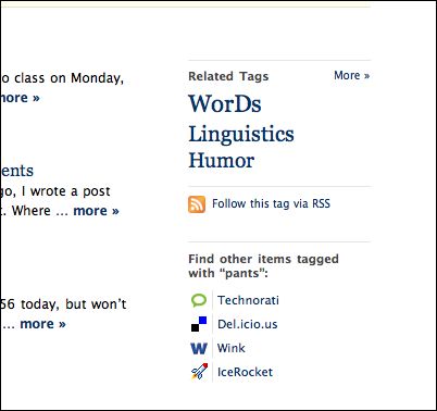 What I find even funnier, is that I see that the list of related tags for “linguistics“, which has related tags such as “languages”, “sociolinguistics,” and other terms you might expect, also includes “pants”. My friends, that is the power of pants.
