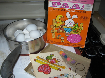 It had been many, many years since I’d dyed eggs for Easter. I think it was probably in the early 80s. I would expect great advances in egg-decorating technology since those times. Remarkably, the package of dye that John’s mother had on hand looked remarkably like the ones I remember from my childhood, though. Here’s our set-up, with pot of hard-boiled eggs and the egg-decorating kit.