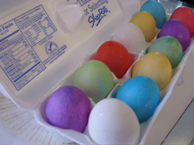 We went down to John’s parents for Easter, and just got back a little while ago. (Ugh, it’s late.) But I wanted to share a few pictures from our egg-related festivities. The highlight of our holiday was having Phoebe’s first Easter egg hunt. To get ready, we dyed some eggs. Here’s the end product. (Two of the eggs seriously cracked during a hideous boiling accident, so were deprived of dye.)