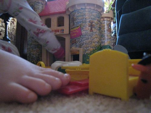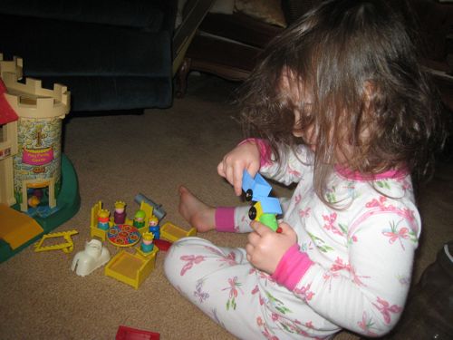 One of the perks of visiting Grammy and Grandpa’s house is that she gets to play with the castle. The castle is a Fisher Price Little People toy set that John played with when he was little. Some of the pieces are a little worse for wear (the poor horses have each lost a hoof or two), but it still makes for some great playing.