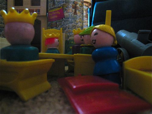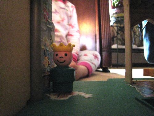 1. Love it! I remember all the excellent Fisher Price stuff my sister had. Those funny little shapely/shapeless bodies and those faces. Too cute. I love the photo of the king, almost as though he’s hiding out … from the pressures of the monarchy or from Phoebe!