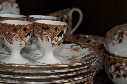 This is part of set of china that was my great grandmother’s. For decades it was in the china cabinet at my grandmother’s house, but now is part of my own collection. I love the dark, bold pattern with its unusual color scheme of rust brown and black. And I love the quaintness of the egg cups, which seem like such relics of another era.