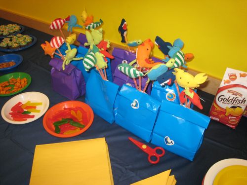 1. Those are little sea life finger puppets from Ikea. (The product name, apparently, is Titta.) They are on some drinking straws. I thought they were too festive to stash away in the bags, so they did double duty as decorations.