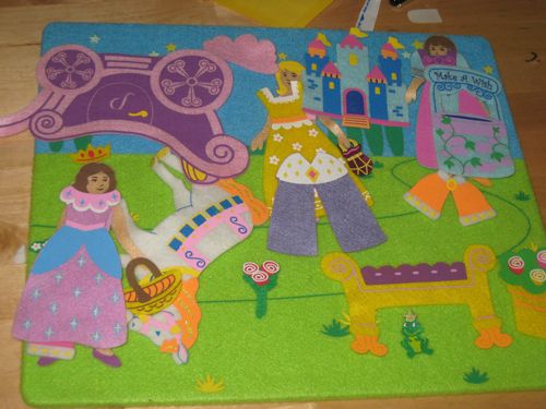 One of the presents Phoebe got for her birthday, when she turned three back in February, was a “Pretty Princess FeltTales” felt board set. It’s actually quite a cool toy, consisting of a felt-covered board with some background scenery, and a bunch of smaller felt cut-out pieces. This particular set has three girls and separate clothing (a bit like paper dolls), a horse and carriage, a frog, a castle, and some other assorted princessy accessories: