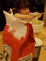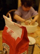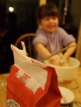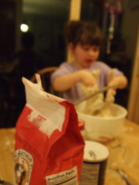 I thought that making and kneading the dough would be a good activity to do with Phoebe, since she really likes to help. (I’m eager to train the kids for hard labor, which should free up more of my time for blogging. Or maybe I should just train Phoebe to blog for me.)