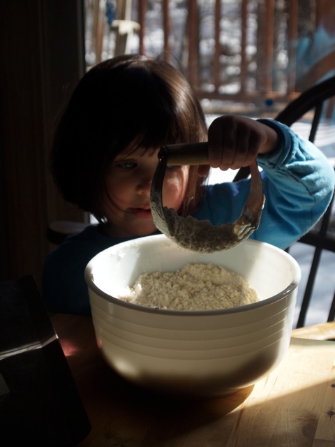 All the photos are great, but that first one, with the Theo kind of silhouetted, Phoebe focused on the dough, and the snow outside, is especially gorgeous.