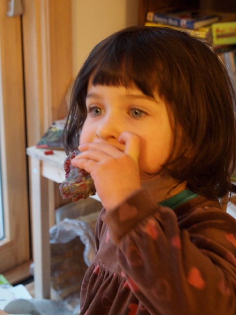 In keeping with my enthusiasm for baked goods, I thought making pink heart-shaped scones would fit the bill. We used the blueberry scone recipe, but used frozen raspberries instead of blueberries to get the scones festively pink. (They ended up more purple and red than pink, and we all agreed that we like the blueberry ones better, but they were still tasty enough for us to gobble them down in short order.)