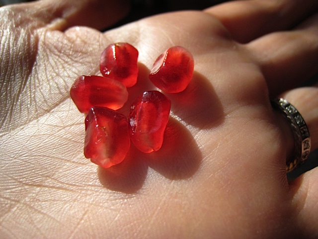 I wanted to put some sort of photo in this post, but spent a ridiculous amount of time trying to figure out which. Here are some pomegranate seeds on the palm of my hand. I took this photo a couple of years ago.