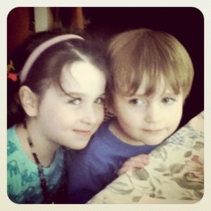 One of my regular pursuits is to try to get a good picture with both Phoebe and Theo. They are often like bouncing atoms, rarely at rest at the same place at the same time. Today at lunch, they were fighting over a particular chair at the kitchen table. I have no idea why that chair. But then they finally agreed that they could sit in the chair together. Oh, the cuteness! I had to get a picture! Of course, my hands were full as I headed towards the table. I turned around to set aside the plates of food I’d been about to serve and pulled my iPod out of my pocket. As soon as I had the camera pointed in the right direction, though, Phoebe decided she was over the moment. She ran off. However, we were able to talk her back to the table, and amazingly, both of them stayed put (without glue or other restraining devices!) while I aimed the iPod camera at them. Rejoice! There was much cuteness to be had. (Not shown, though, are the shots of the kids with food hanging out of their mouths.)
