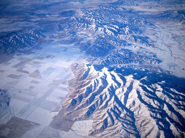 My choice of window seat was once again rewarding. (I’ve long been taken by the patchwork pattern made by agricultural fields as seen from above. Today the ones I passed over were snowy. This particular quilt of fields is tucked into a valley among striking mountain ridges.) I was doing work on the plane, and found the views to be somewhat distracting. I kept grabbing for my camera. Luckily, flying away from the sun meant that it got dark a couple of hours into the flight.