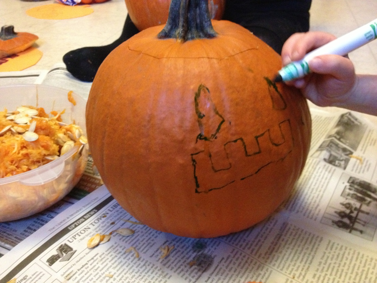 As I’ve said before, I love Halloween. It is quite possibly my favorite holiday. I wish I’d had time to post more Halloween-themed things, but so be it. But here, at least, are a few photos featuring our pumpkins. (Carving pumpkins early in the evening on Halloween seems to have become a household tradition. )
