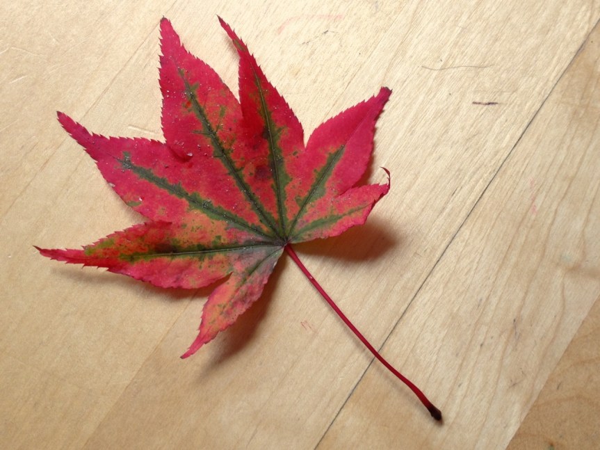 On a morning walk in my neighborhood a couple of weeks ago, a bright Japanese maple leaf laying in the road caught my eye . I picked it up, carried it home, and took its picture on my kitchen table.