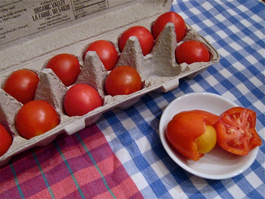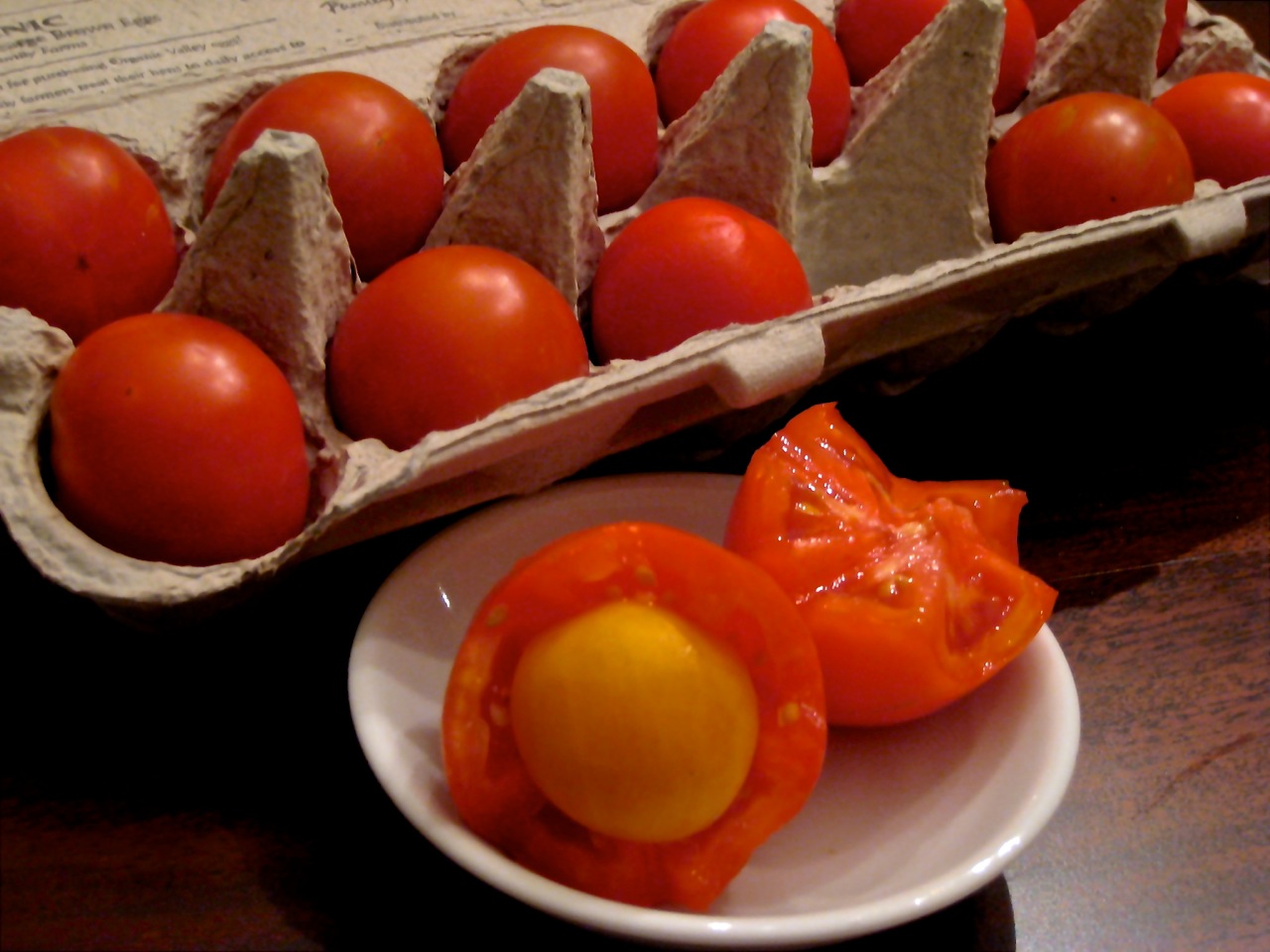 I also had fun taking photos of the tomatoes. One week I had a large number of little egg-sized tomatoes, which inspired me to play with my food. (The yolk is a little round yellow tomato.)