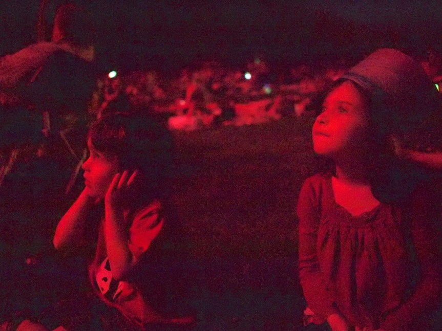 Theo was quite scared by the fireworks 2 years ago, or at least by the loud noises. (He did like the pretty lights.) This year, he only half-heartedly covered his ears. Phoebe was fully entranced. (Here I had to crank the ISO way up to 1600 to see anything. The red glow is likely from some red fireworks–the only light I had in this shot.)