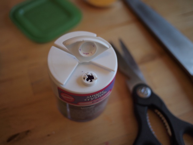 I was lucky not to have injured myself in this step. They also make sugar that comes in separate jars, which is easier to pour.