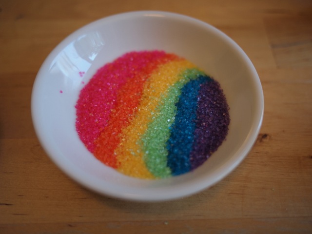 - decorating sugar in a range of rainbow colors (also called sugar crystals or sugar sprinkles) I used bright pink, orange, yellow, light green, light blue and purple