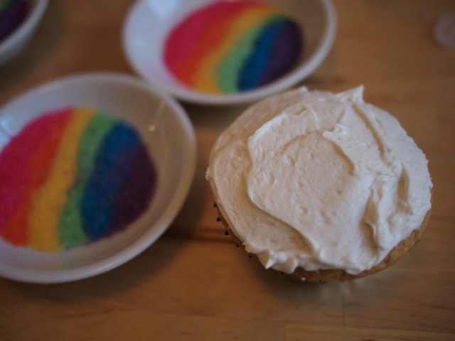 Over the last couple of years, and several cupcake productions, I came up with a method for making rainbow-topped cupcakes that is easy, fun, and very colorful. (Did I mention they have rainbows? We’re big fans of rainbows in this house.)