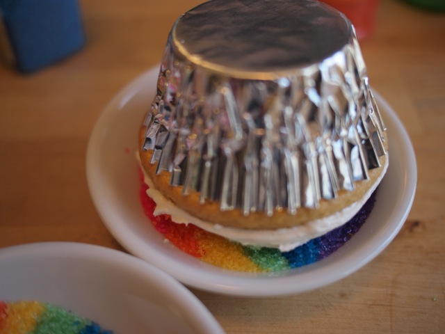 6. Invert the cupcake, and carefully lower onto the sugar stripes. Gently roll it around, pressing lightly, so that the whole top of the cupcake makes contact with the sugar.