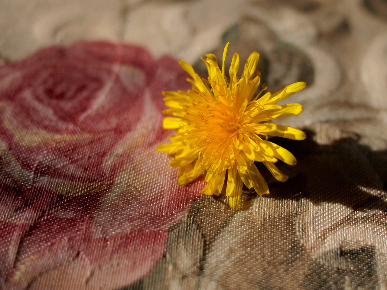 I love this. I’m a fan of dandelions (and yellow), and I totally remember the series of photos you took of this one. But this is neat because there’s something sort of meta about it. I think I like the fact that the image on the tablecloth is a rose, which is typically a cultivated flower, and then the actual flower that is in the photo is something usually considered a weed.
