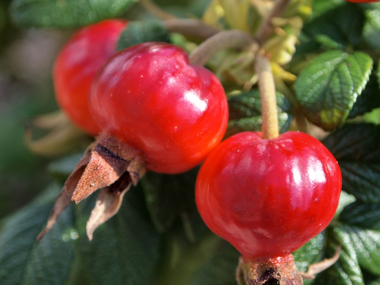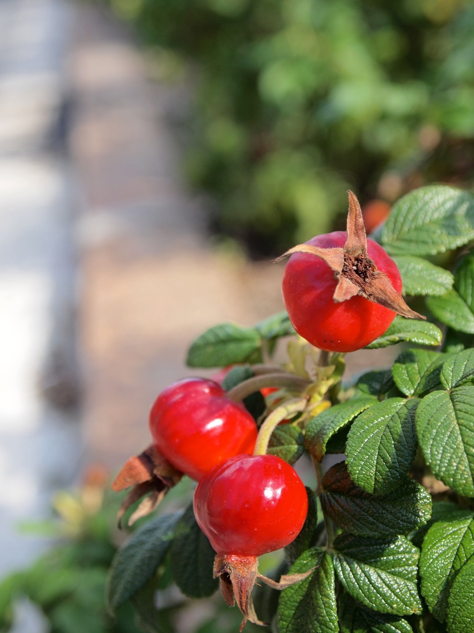 After I posted yesterday’s relatively un-rosy photo of a dandelion, I realized that while I don’t have many photos of roses, I do have some photos that I quite like of rose hips. These berry-sized red fruits are packed with vitamin C and other valuable nutrients. They are also quite pretty. I came across these particular rose hips in September three years back, in Boston alongside a T stop at BU.¹