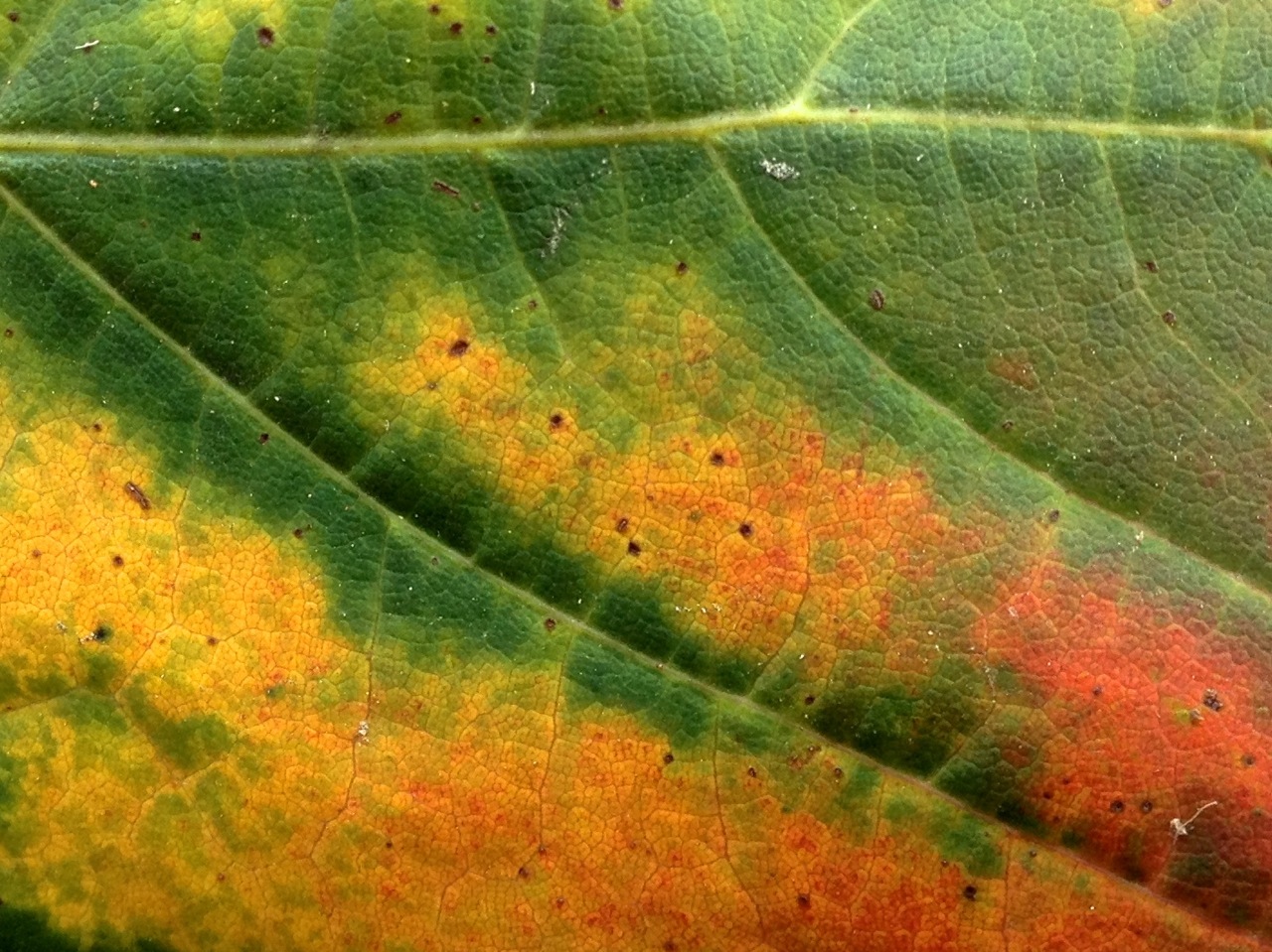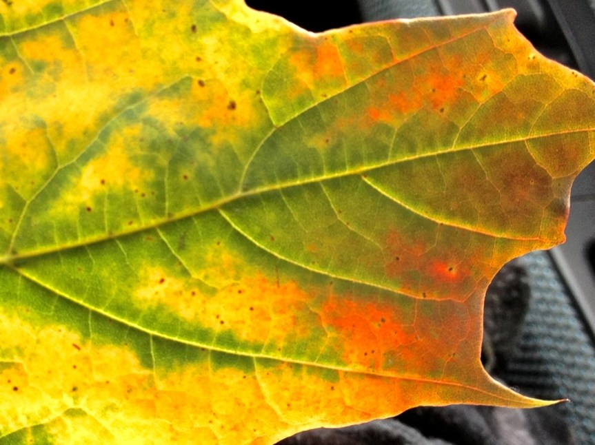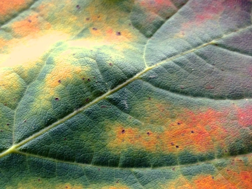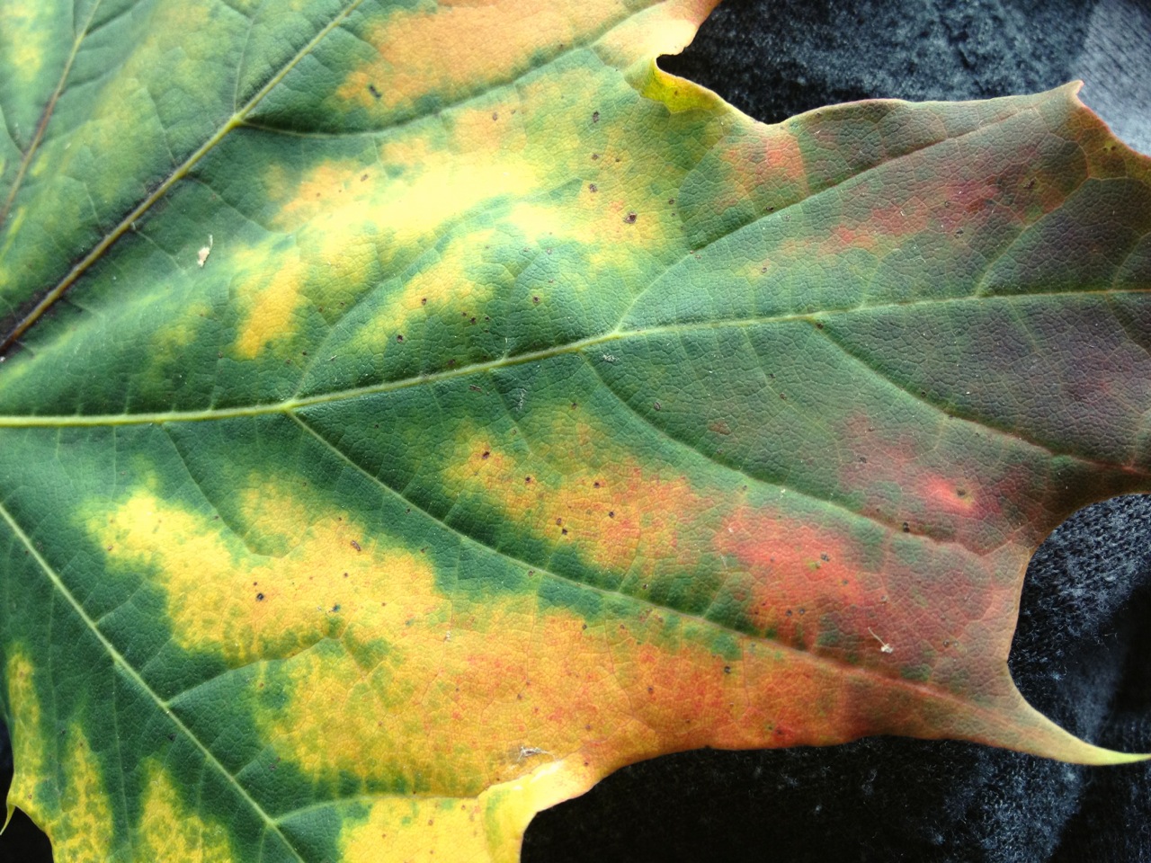 Today is the autumnal equinox here in the Northern Hemisphere, and the official first day of fall. I am going to use this as an excuse to post more photos of leaves. (Though, actually, it’s just multiple photos of the same leaf. But still…)