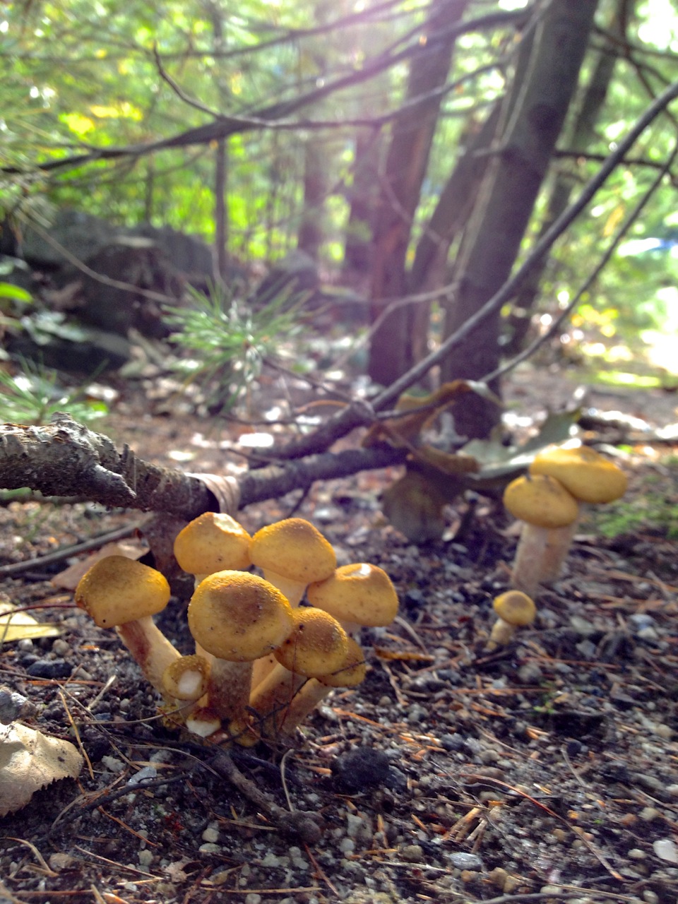 While poking around in my photo library for something to post today, I came across this pair of photos. Noting that they were taken 2 years ago to the day, I figured it was a sign. (Perhaps a sign that I am compulsive for even noticing such things…) Anyhow, I often find myself standing outside at the top of my driveway twice a day: waiting for the school bus to come collect my children in the morning, and then again in the afternoon for the same bus to deliver my children back to me. (It is really quite a marvellous phenomenon.) Some mornings are quite hectic, and involve us scrambling to get ourselves together, and rushing out with me feel too frazzled and tired to notice much of the world around me. Happily, other mornings I can enjoy the bits of nature that line our street and driveway. One such morning, I admired these little groups of mushrooms catching rays of the bright morning sun.