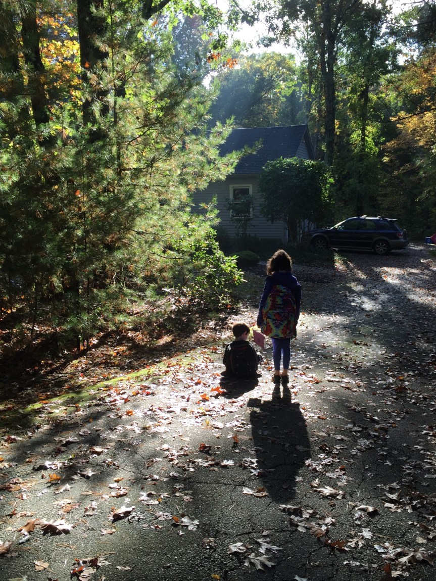 The kids, standing among the many freshly fallen leaves on our driveway, and enjoying the bright morning rays.
