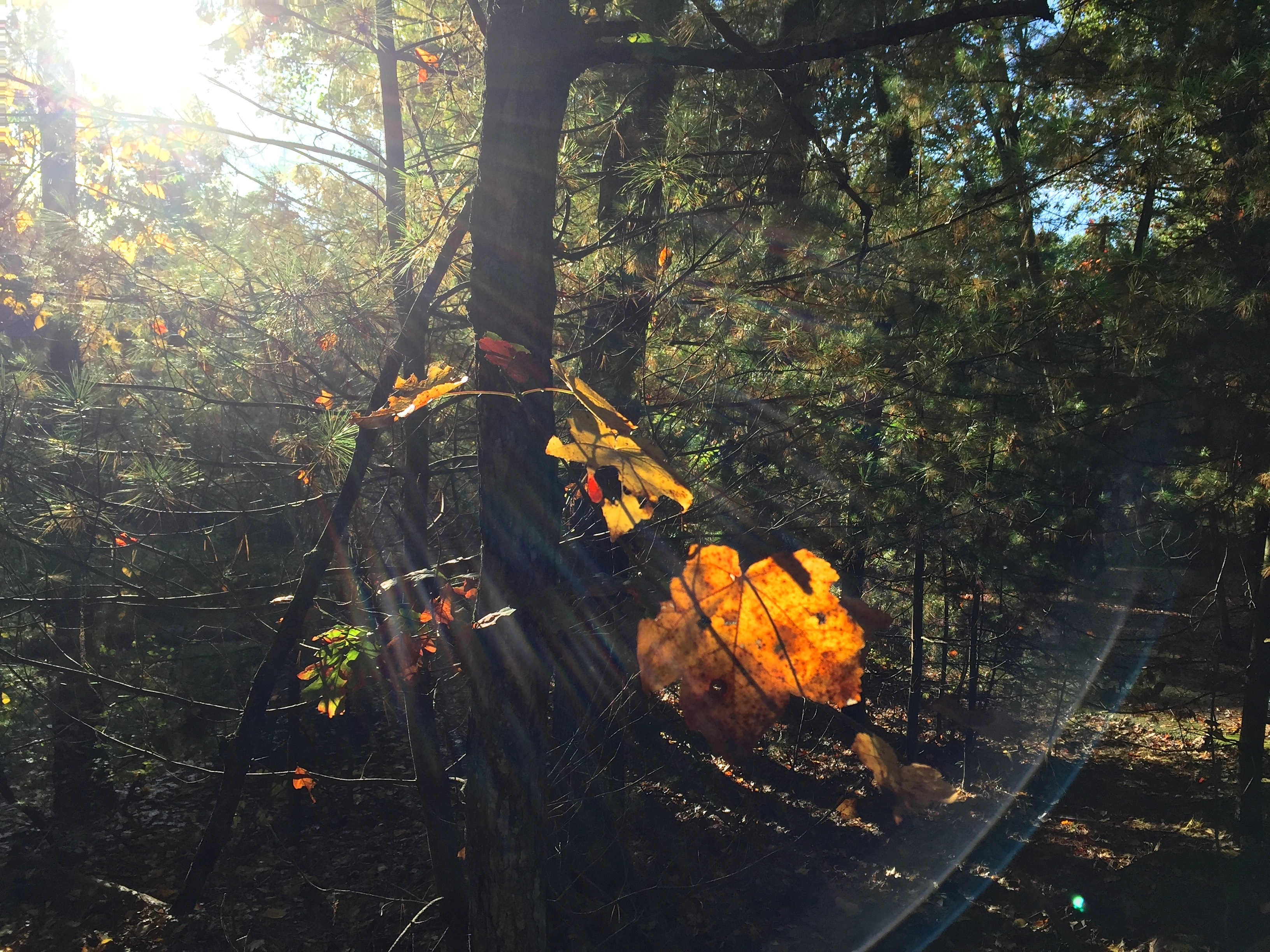 Most of the maple leaves had been knocked off the trees by the previous days’ wind and rain, and the few remaining hangers on appeared to float in the bright sunlight.