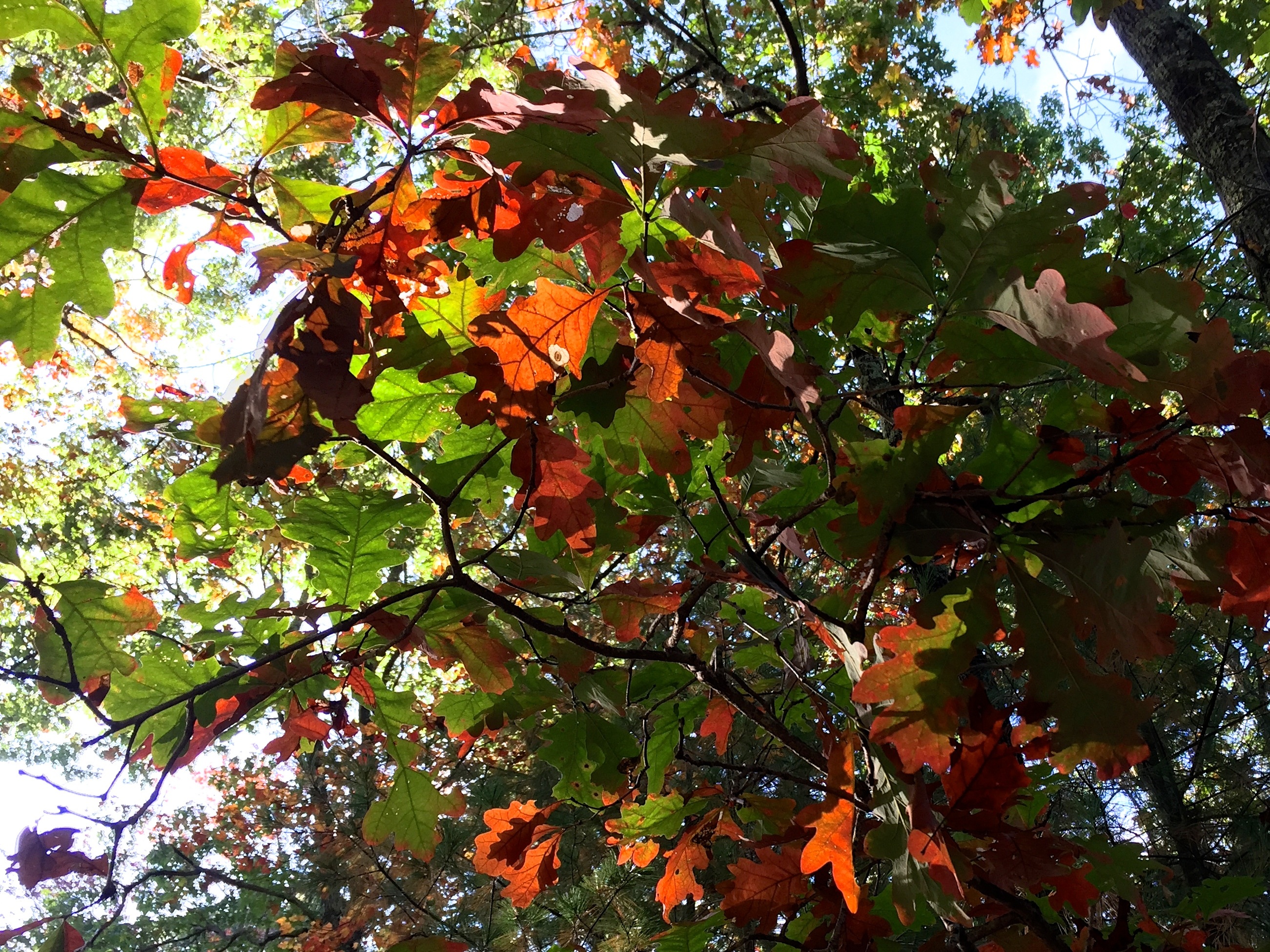 I love the confusing patterns formed by the mingled orange and green oak leaves and their shadows.