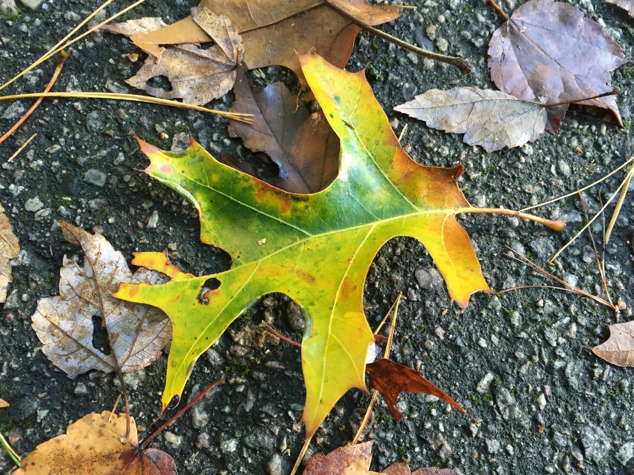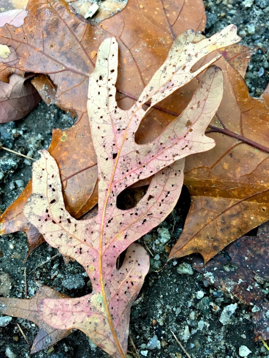 After taking this photo a few days after the photo above, I realized that it was almost certainly the same leaf that caught my eye again. (If you mentally flip it over, you can see the same shapes in the holes.) It’s interesting to see how the color of the leaf continued to change after falling on the ground.