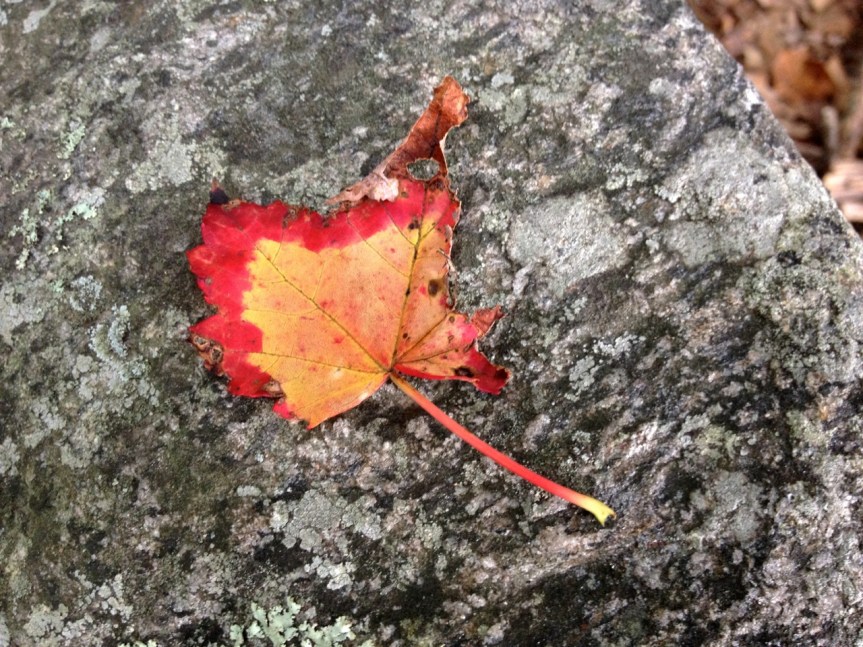 This seems to have been an especially good year for caterpillars, because I’ve noticed that almost all of the leaves that fall (as well as those still up in the trees) have quite a few holes or other evidence of having been munched. In spite of these flaws, I still find the leaves to be quite beautiful. Many of the holes even add to their character. (This is not the first time I’ve made that observation.)