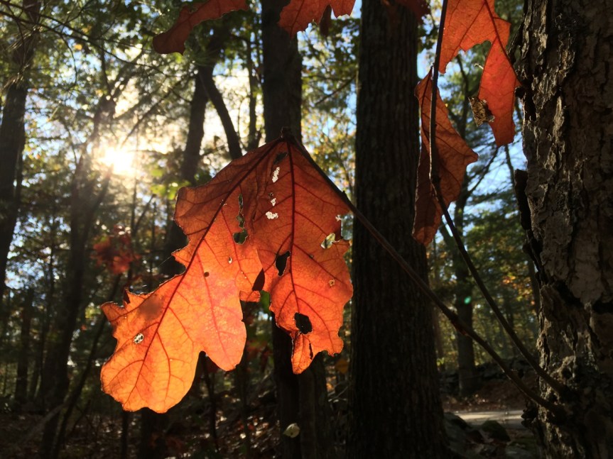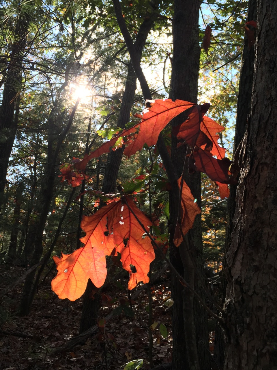 A few days ago, while waiting for the school bus, I noticed a cluster of oak leaves being illuminated by the low afternoon sun. I was quite pleased that I was able to capture some of their striking orange glow.