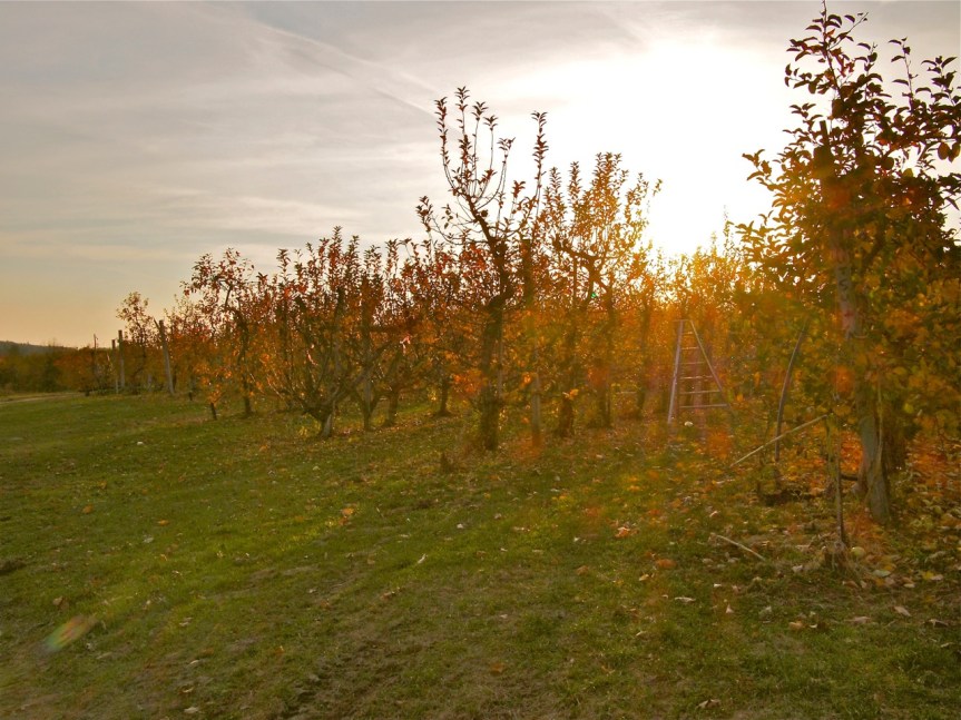This was a photo from 2011, from late-ish November. That fall was a particularly mild one, and one of my favorite local places to pick apples was still open for pick-your-own. The afternoon was a beautiful one for both picking apples and taking photos. (I posted quite a few photos from that excursion back in 2011, but this one seems not to have made the cut.) The late afternoon sun made everything glow in warm and bright hues, living up to the promise of the golden hour. In this shot, I love the way the lens flare made orange blobs over the image, which echo the glow of the orange leaves on the apple trees.