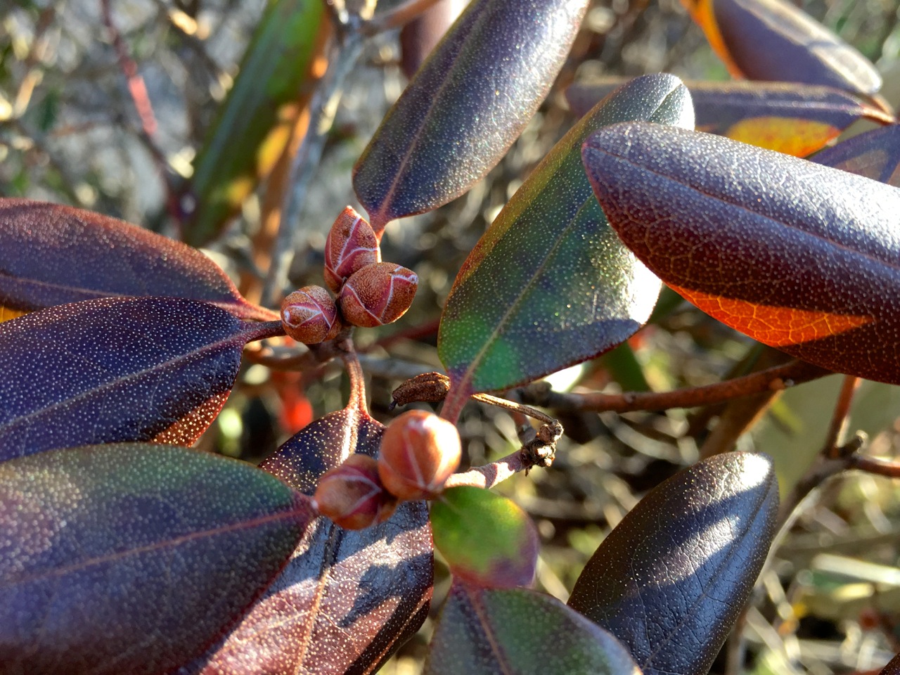 While I tend to think of buds as signs of spring, some shrubs form their buds in the fall. These colorful rhododendron leaves and buds caught my eye a few mornings ago as they caught some rays of the morning sun.