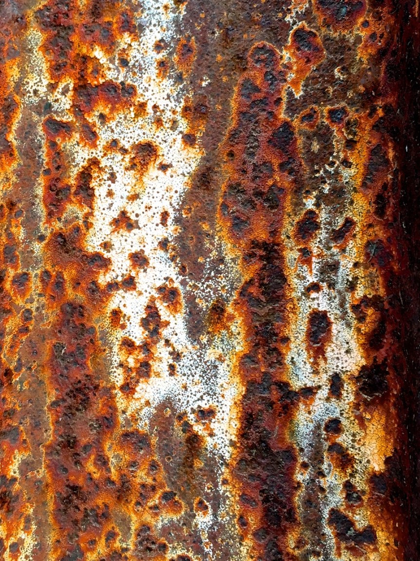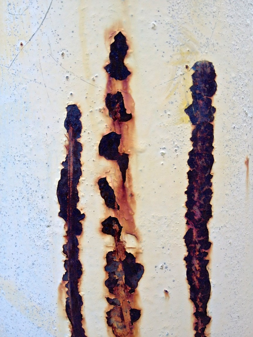 I’ve said before that I love the patterns produced by rust and weathered paint. The bold compositions produced by the elements working away at metal surfaces covered in their flimsy dressing of paint can rival those of some of the most venerated abstract expressionists. These canvases, however, are not so much the kind you find in museums, but rather on dumpsters, storage containers, parking lot barriers and such. Here are several examples of compositions of rust and weathered pain that caught my eye, several for producing patterns that were almost floral in appearance. (I realize that what these also look like are inkblots. What do you see in the pictures?)