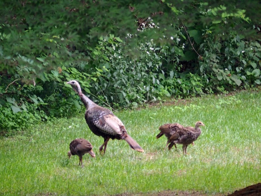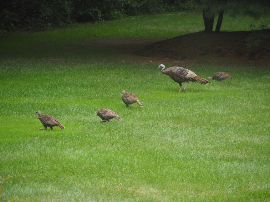 Our family, especially the younger generation, has been enamored with birds in general. So, we tend to enjoy these visitors. The one exception to this was when we had our lawn re-seeded. Then I was rather displeased to see the flock of turkeys out on the front lawn, enjoying the grass seed buffet. There were more than a few times when neighbors may possibly have seen me running across the lawn, waving my fist and shouting, “get off my lawn, you whippersnappers!” Or something like that. I did also enjoy a strategic use of the newly repaired sprinkler system, turning on the sprinklers right where the gang was pecking at the lawn.