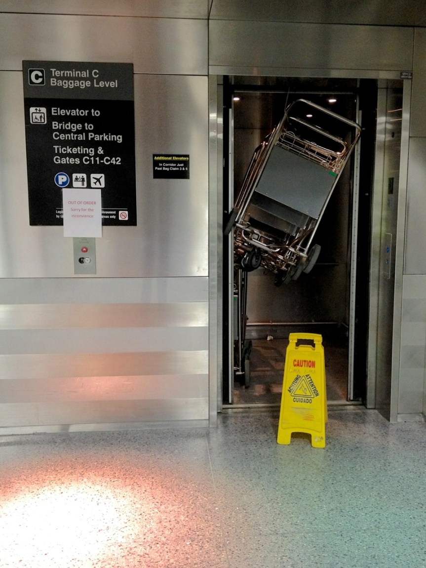Like the elevator in this photo, it would appear that this blog has been out of order. Obviously, the trouble here is that I have gotten baggage carts stuck in my door. Once the obstruction is cleared, I expect to be back in order soon. Meanwhile, please take the stairs.