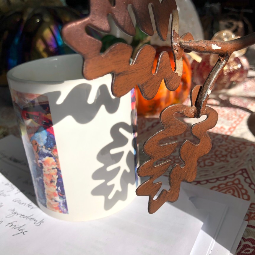 These metal leaves are a decoration I recently got at a thrift store. (My daughter and I have discovered a mutual enthusiasm for going to thrift stores. Possibly too much enthusiasm.) Anyhow, the leaves cast some fun shadows in the low afternoon light. I enjoyed seeing how they changed (sharp above, doubled below) with the changing light.