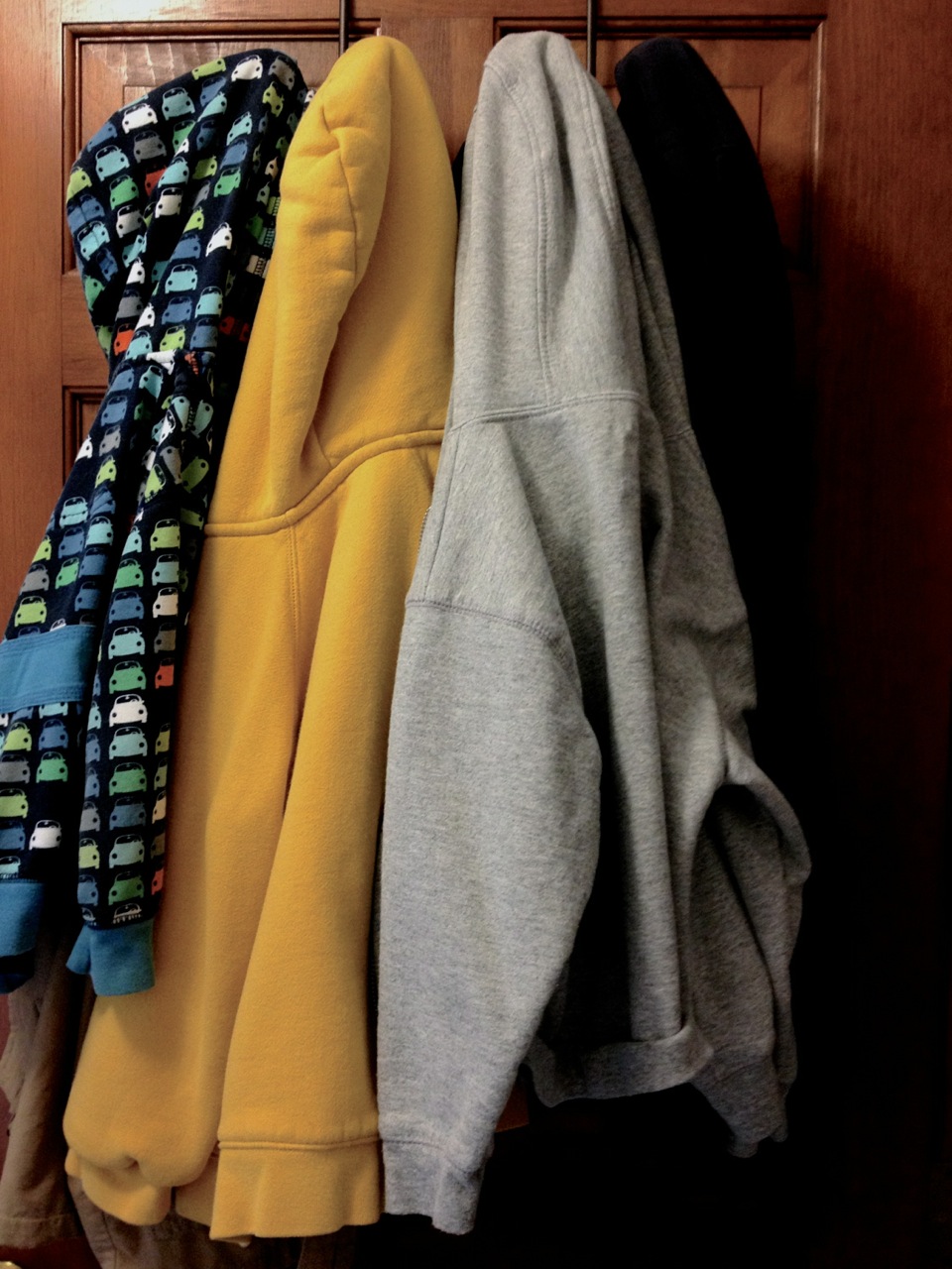 We wear hoodies in our family, all 4 of us. I am the mother of 2 young children, one a little boy. He probably has more hoodies than the rest of us, in a range of colors. He even has a gray hoodie, one that we got during our visit to my husband’s high school for a reunion a few months ago. Each day when we send him to his pre-K class, we have to send him in with a sweater or sweatshirt. Even on hot summer days, since New England weather can turn quickly, or the air conditioning inside can be excessive. This past week, I have found myself consciously avoiding that gray hoodie. I see it hanging there on the hook on the back of a door, along with the yellow hoodie and the blue one with the prints of cars.