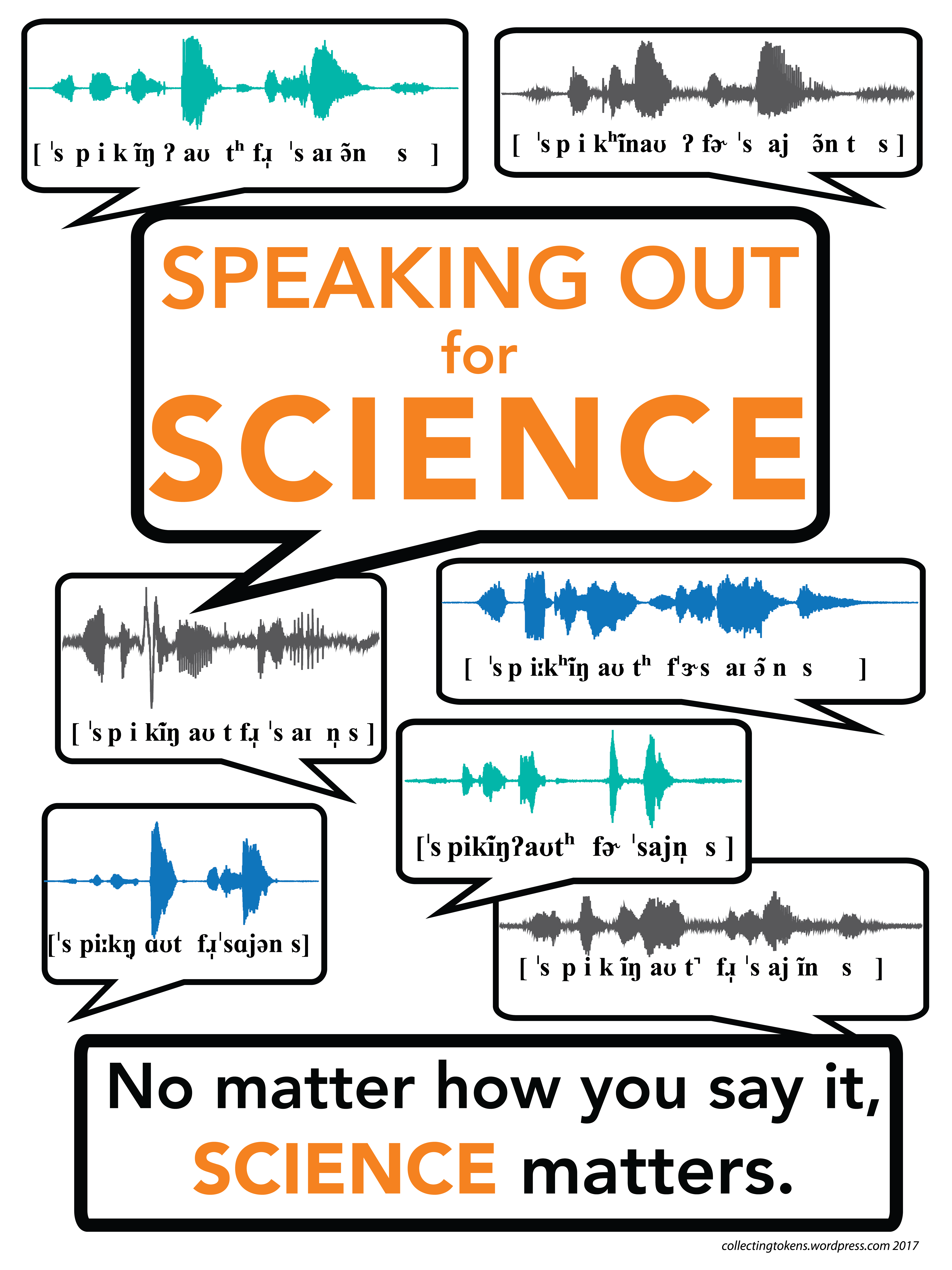 So I made some revisions. Whereas the possible variation in saying a simple 4-word phrase at first seemed like an obstacle to get around in choosing a representative production to use for my design, I realized that it was an opportunity for a new design to reflect the variation itself. And so I asked my friends and those friends of friends who’d been part of the discussion to submit recordings of themselves saying the phrase, with the option of sending their own transcription. My new design has 7 different productions of the phrase “speaking out for science,” along with a new sub-slogan: “No matter how you say it, science matters.”
