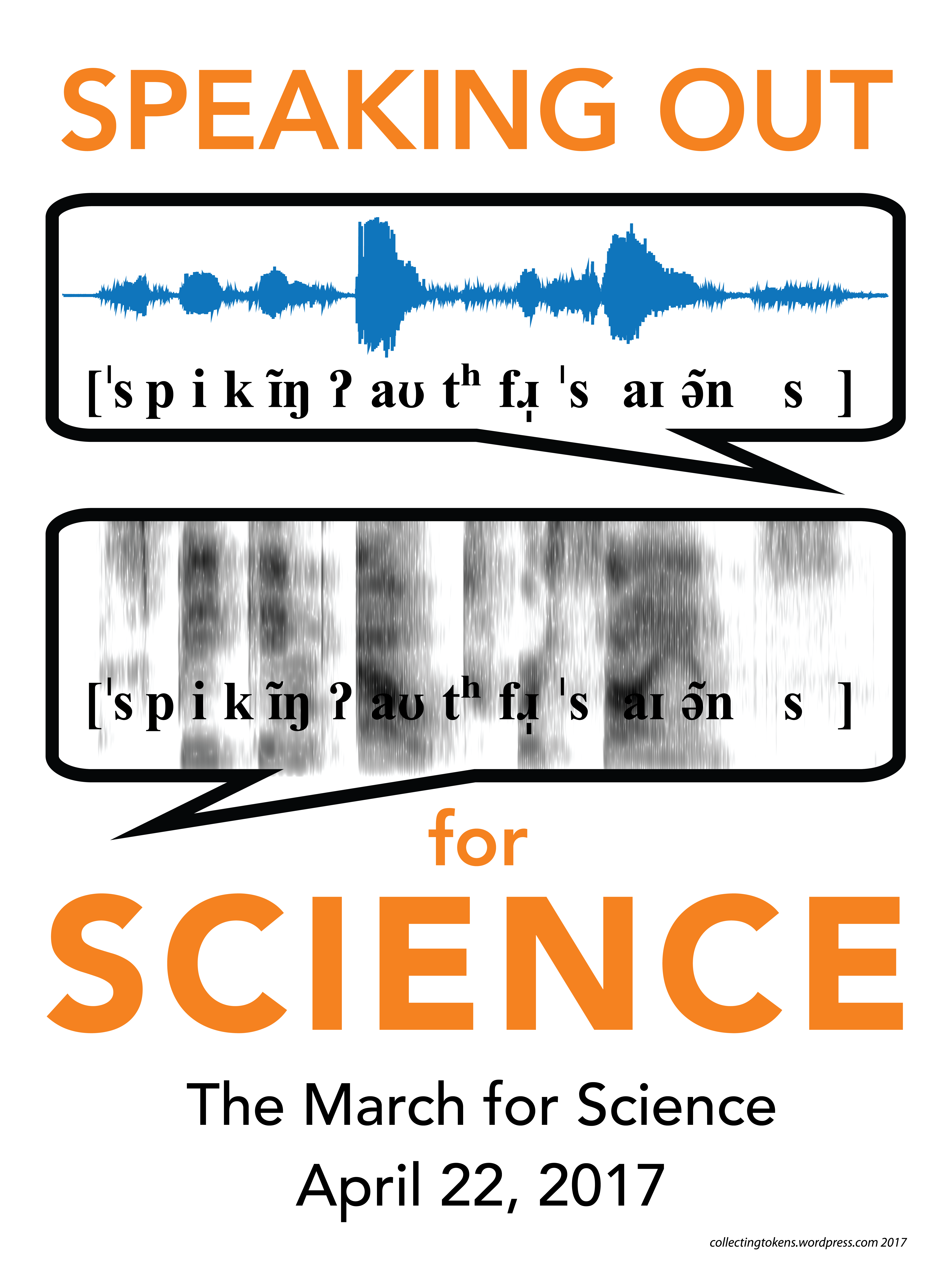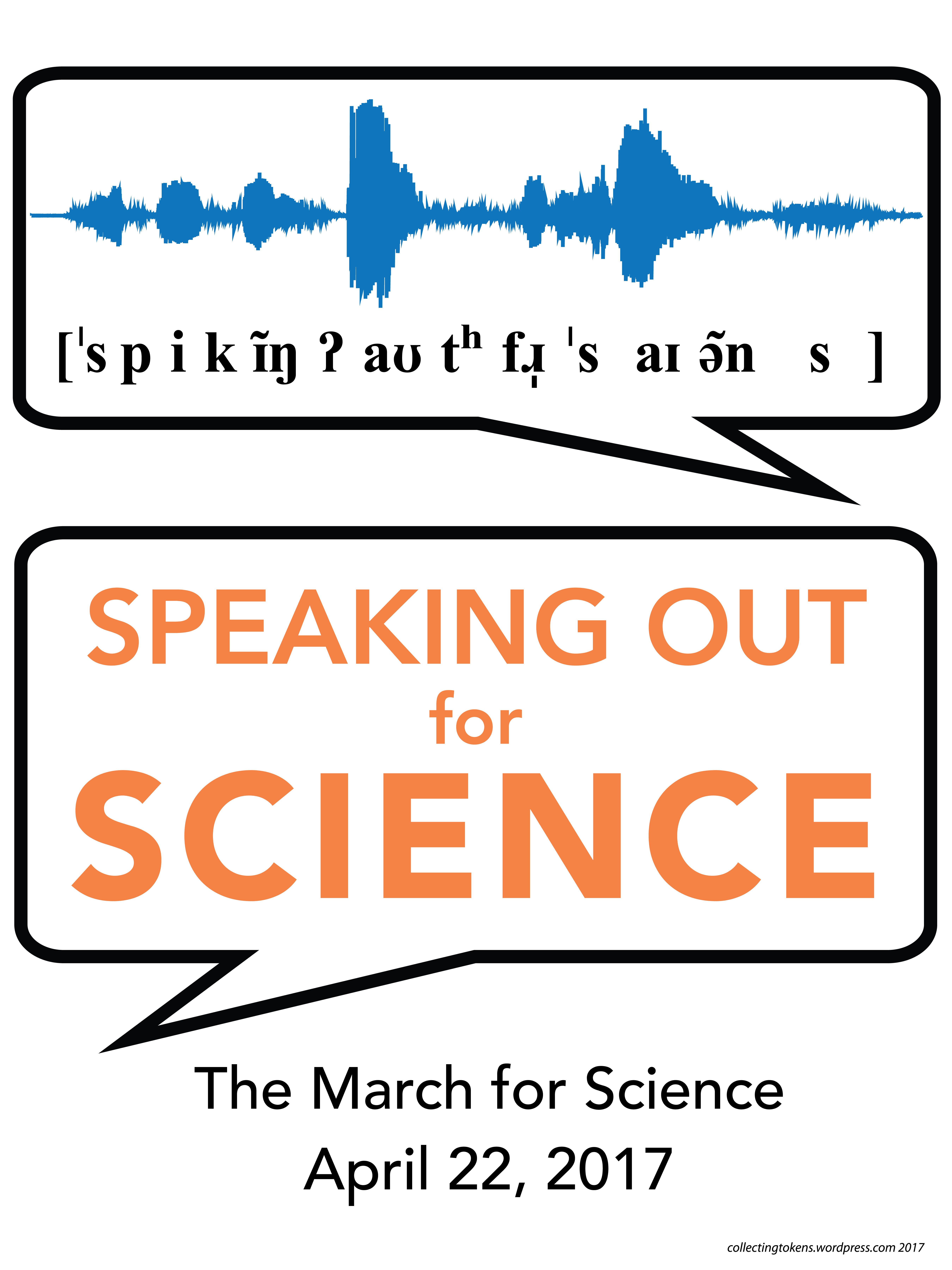 Soon after I heard about the march, I not only planned to go, but started working on a design for a t-shirt and sign. As I am a linguist, I wanted to represent speech and language sciences. I made a recording of myself saying my slogan, “speaking out for science,” and put together a graphic with the (orthographic) text, a waveform, and a phonetic transcription in IPA. I put up a draft of my design on Facebook, and got some feedback from other linguists on my transcription. I made a new recording with some clearer articulation, and put up a new image and transcription. I finalized a couple versions of my design (one with a spectrogram), and set up a storefront on TeePublic (an online t-shirt store), and lo and behold, several people ordered shirts!