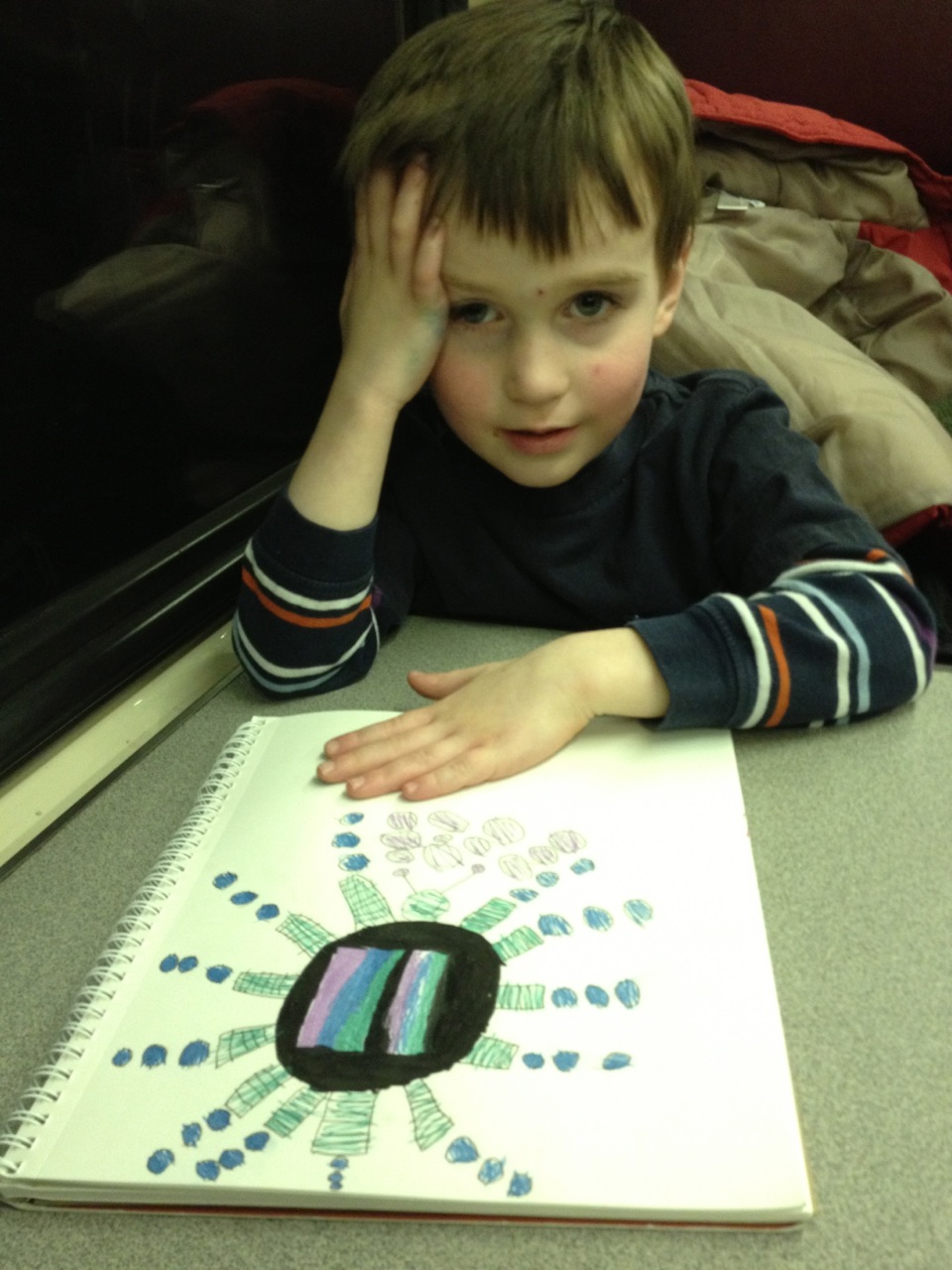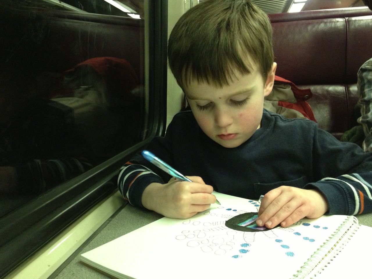 On the train home, we managed to score one of the coveted tables. Theo was happy to be able to draw some more. He spent most of the train ride drawing.