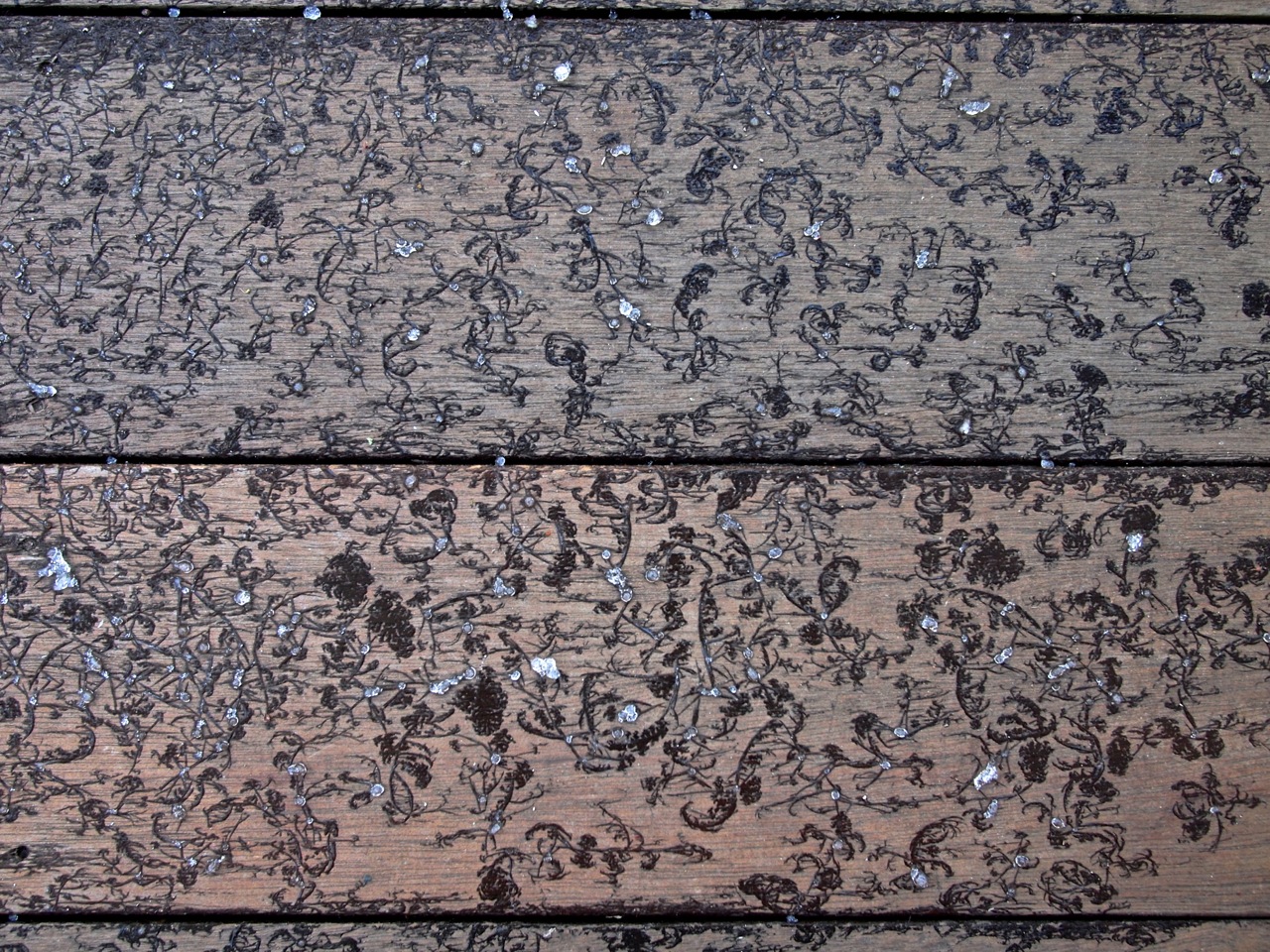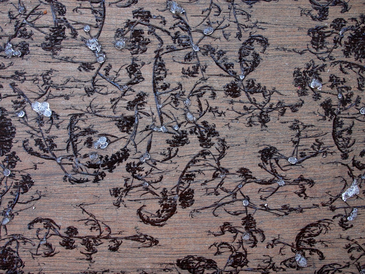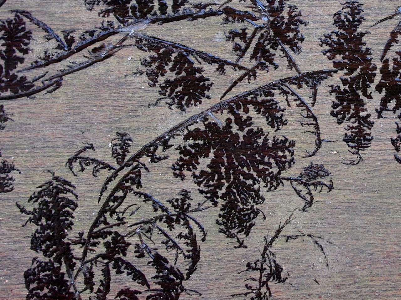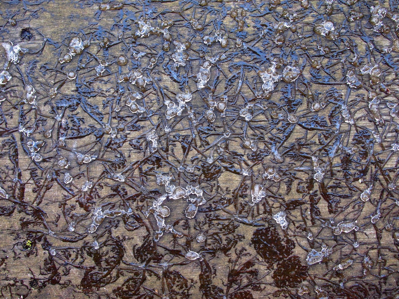 It snowed overnight here, and there was apparently freezing rain and wind as well. I had opened the front door to get a look at the snow in the front yard, and was greeted by all of this. As best I can guess, little drops of watery ice that landed on our porch were blown around by the wind, leaving little streaks of ice behind them. (This is much like what I guessed happened the morning I found frost feathers on my car.) Either that or it was indeed the ghost of William Morris, and he spent the whole night drawing his patterns on the porch.