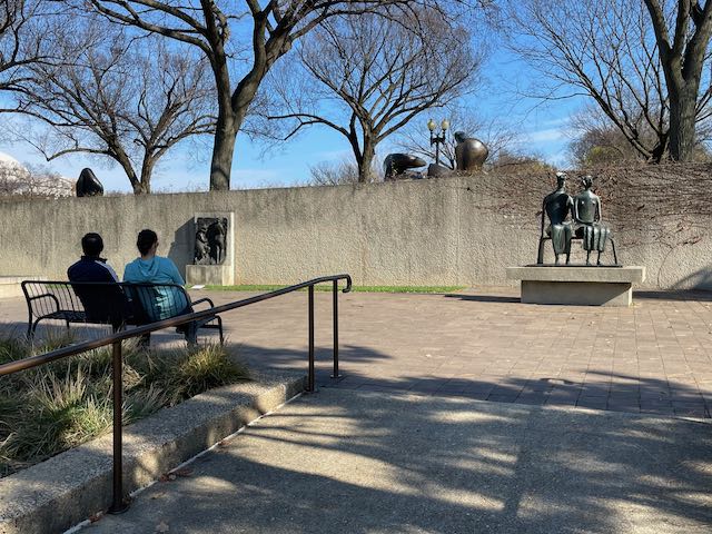 Once again, I forgot to post yesterday. It was a long day of activity, ending with a trip up to Maryland for a visit to a close friend from high school. I fly back home tomorrow. After several days of lots and lots of walking, it was nice to have a day mostly sitting around today. On that note, here is a photo I took yesterday of some people sitting around on benches in the Hirshhorn museum sculpture garden in DC.