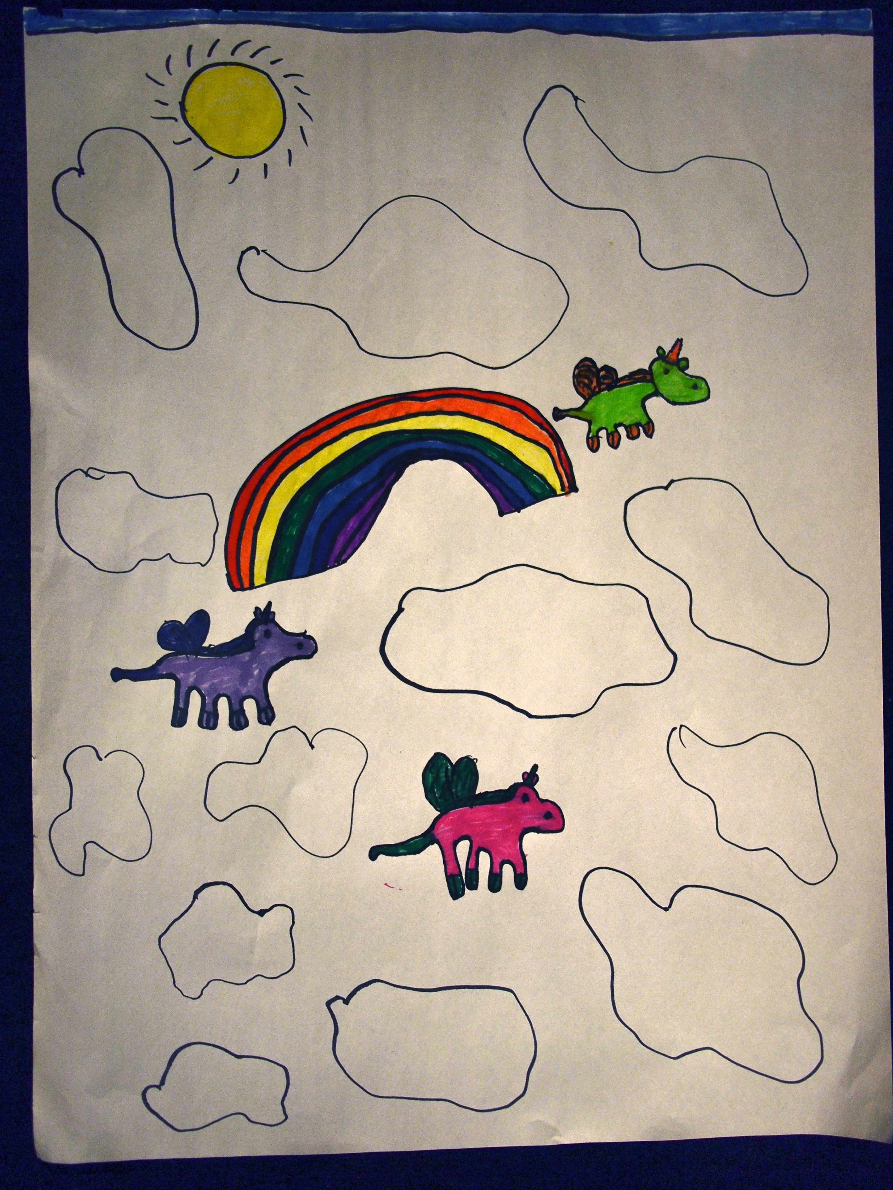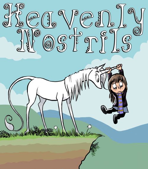 Image credits: Heavenly Nostrils artwork by Dana Simpson from Ink & White Space, used with permission from Dana herself, because she is that cool. Pegasus-unicorns flying among clouds and rainbow artwork by Phoebe Lenore, used without her permission because it’s 10 at night and she’s in bed right now. The rainbow unicorn cupcake photo is mine, all mine. And the two of Phoebe in unicorn hats. But neither of the hats is mine.