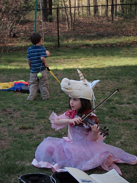 Photos of Phoebe’s drawing of pegasus-unicorns, Phoebe in her unicorn snow hat with a snowball, and Phoebe playing the violin in a borrowed unicorn hat.