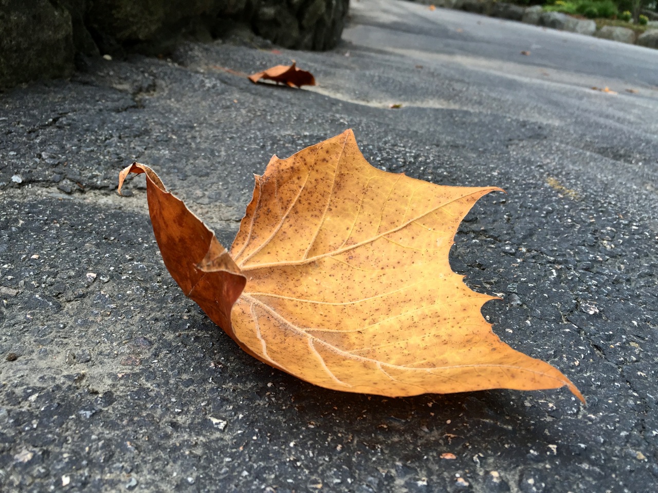 After taking this photo a few days after the photo above, I realized that it was almost certainly the same leaf that caught my eye again. (If you mentally flip it over, you can see the same shapes in the holes.) It’s interesting to see how the color of the leaf continued to change after falling on the ground.
