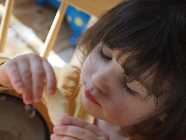 Phoebe enjoys her breakfast with pears, oatmeal and reference-resolution adventures.