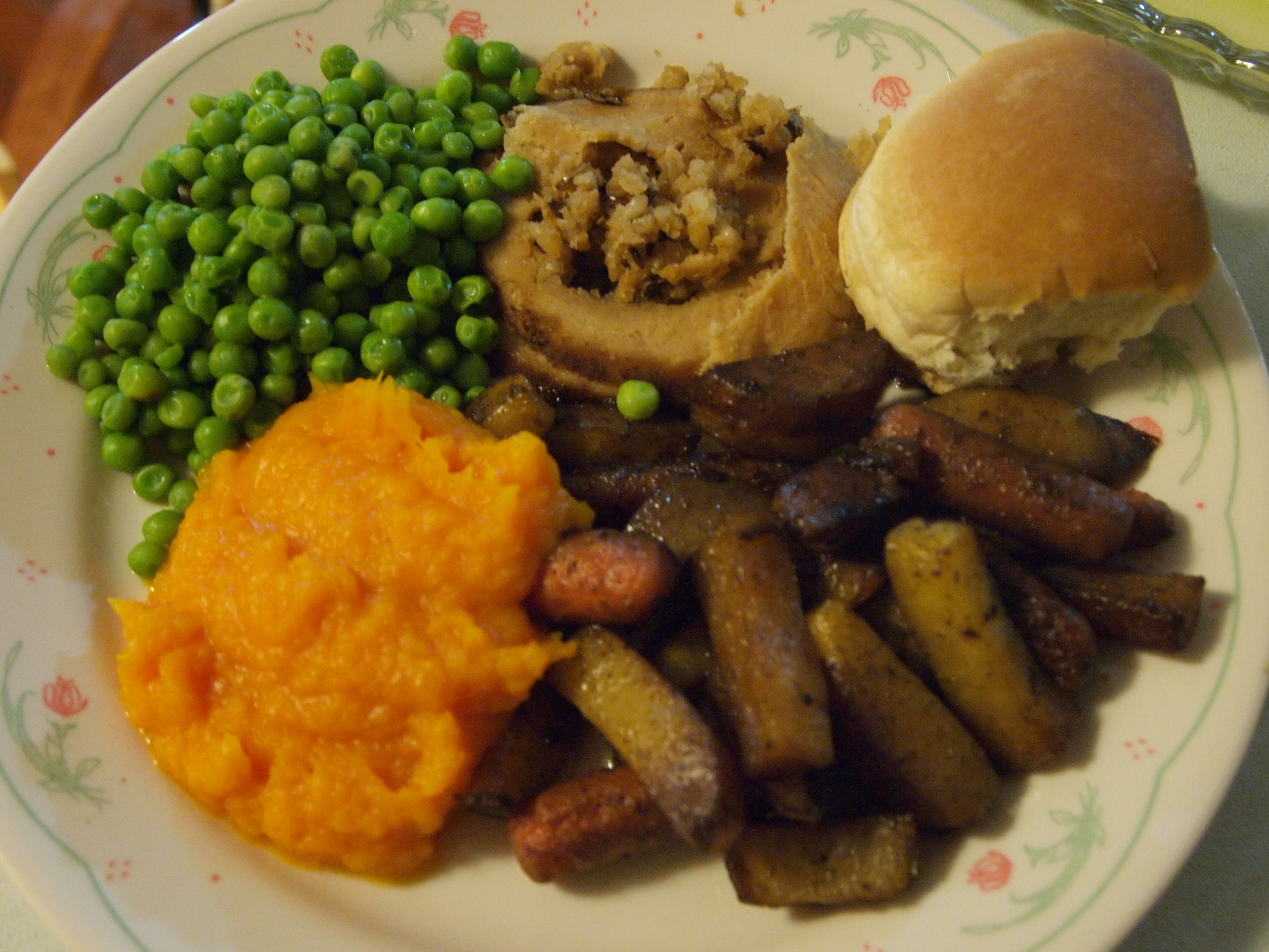 My plate held many vegetables. Also tofurkey and a roll.