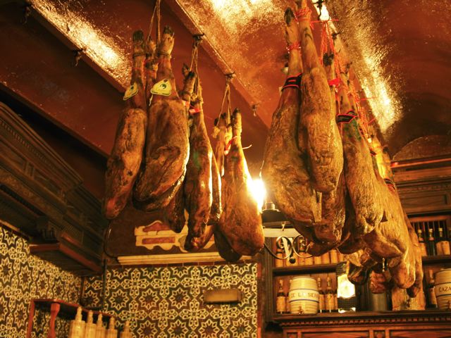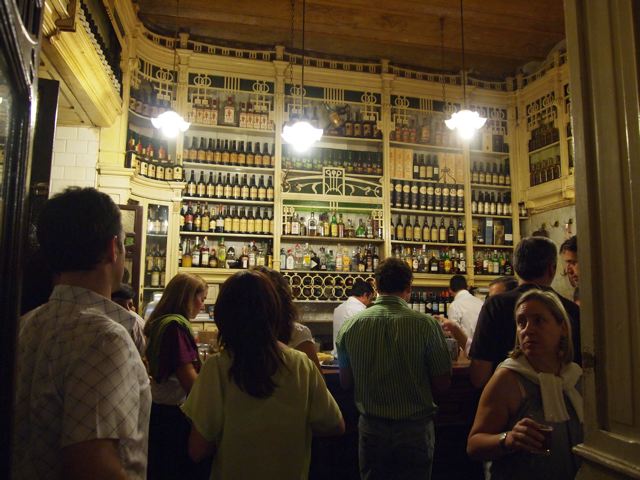 Our first stop was El Rinconcillo, which az tells us is the oldest bar in Sevilla. I loved the decor of the place, which was dominated by dark woods, patterned tiles, and shelves well-stocked with bottles. (Not to mention hanging hams.) We stood at the bar.